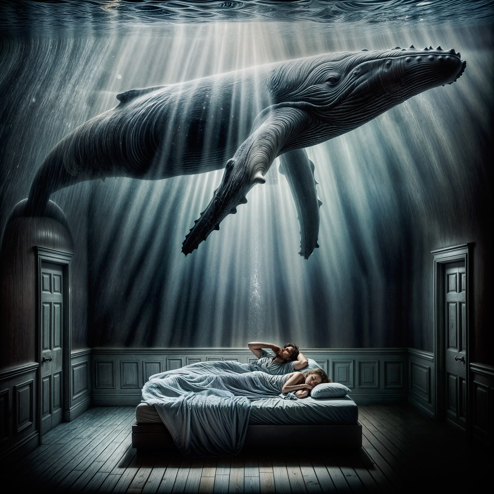 Герой находится в состоянии глубокой эмоциональной изоляции и подавленности. Во сне его бессознательное символически прорывается: вода и киты, символизирующие мощные и неконтролируемые силы бессознательного, — указывают на глубинные страхи и подавленные чувства. Дыхание, как символ жизни и взаимосвязи с другим человеком, — подчеркивает его зависимость и страх утраты собственной личности. Попытки героя разучиться дышать ради другого — указывают на его жертвенность и внутренний конфликт между собственными желаниями и потребностями другого человека.